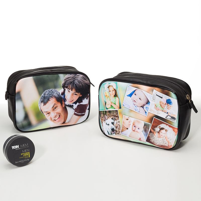 Practical and stylish, it comes in your choice of either hard-wearing black canvas or a chic leather trim. Its chunky zip runs centrally across the top and partially down the sides gives easy access to the generous interior. This smart wash bag also features handsome leather tabs. Our popular men’s wash bags are perfect gift ideas for men at Christmas, Father’s Day, and birthdays. For a thoughtful gift, pick out your favourite photo and put it on this stylish wash bag. Celebrating years together? Why not give him a designer toiletry bag featuring a photo from a special day together. Ideal for anniversary gifts(cotton canvas or leather themes). You can even have couple's matching custom ladies cosmetic & men's toiletry bags.