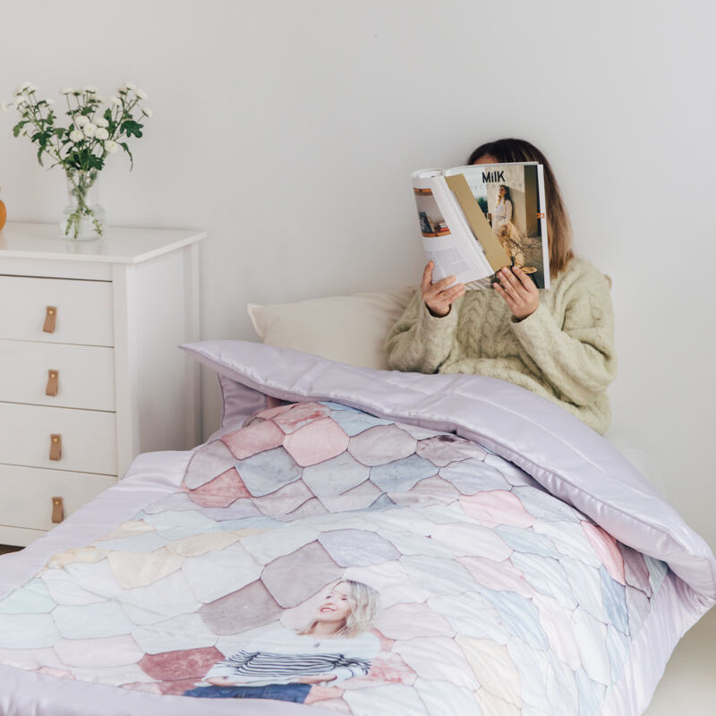 The colour that you choose for the back of your photo patchwork quilt will also be used for the border on the front. Choose from lilac, ivory or pink, selecting the best colour to complement your design. The border is a classic design feature of a patchwork photo quilt, and gives your quilt a homemade charm. To recreate the look of a patchwork quilt, choose to make a photo collage where you can print loads of your favourite snaps. It's a contemporary alternative to traditional patchwork style blankets. Simply upload your photos and select more than 1 in the design interface. Here you'll be able to choose from ready-made montage styles or rearrange the photos manually to create your own.