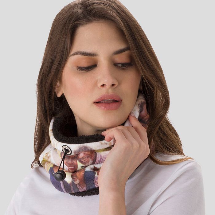 Your photo/s are printed directly onto the rectangle strip of polar fleece fabric, so it wraps around from the front to the back. If the photo you would like to print becomes distorted, you could make it smaller and position it to the centre of the front and then choose a complementary colour or background for the rest of the personalised snood. Alternatively, create a scattered photo collage featuring a selection of snaps. Upload your photos, select all and then choose from several automated montage styles, or rearrange and edit manually.
