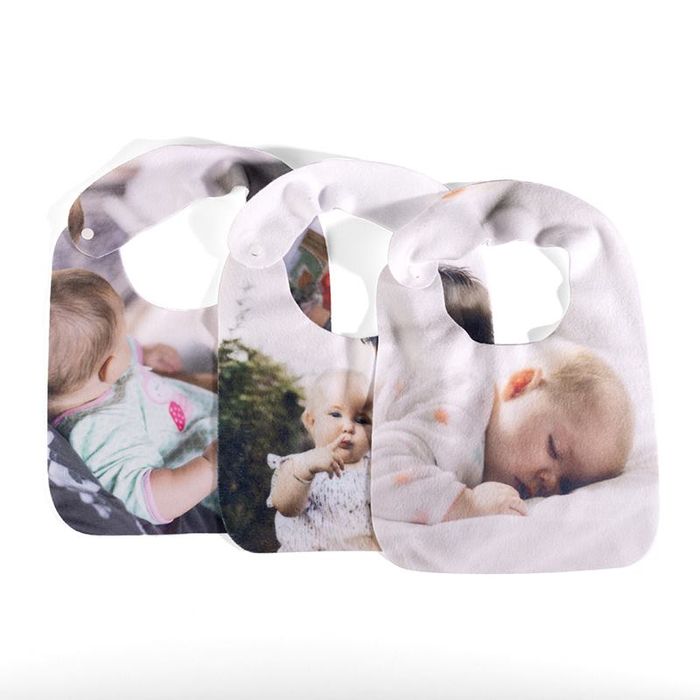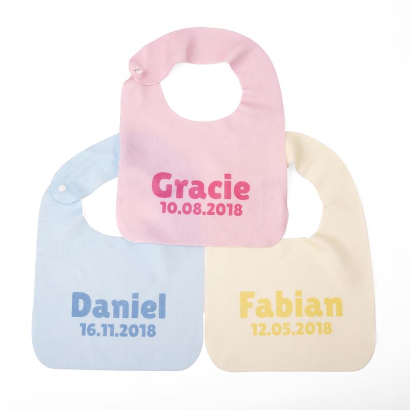 Your pack of personalised baby bibs feature your own personal design printed in full glorious colour on the front of the polar fleece bib, with a plain white backing.