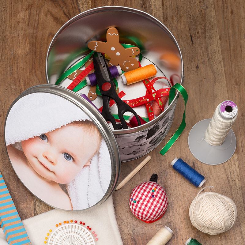People use these tins for lots of storage ideas where they need a round metal tin with lid to help contain things. Especially useful as personalised round tin gifts where you are giving another gift inside our customisable round tin, like scarves or teddy.