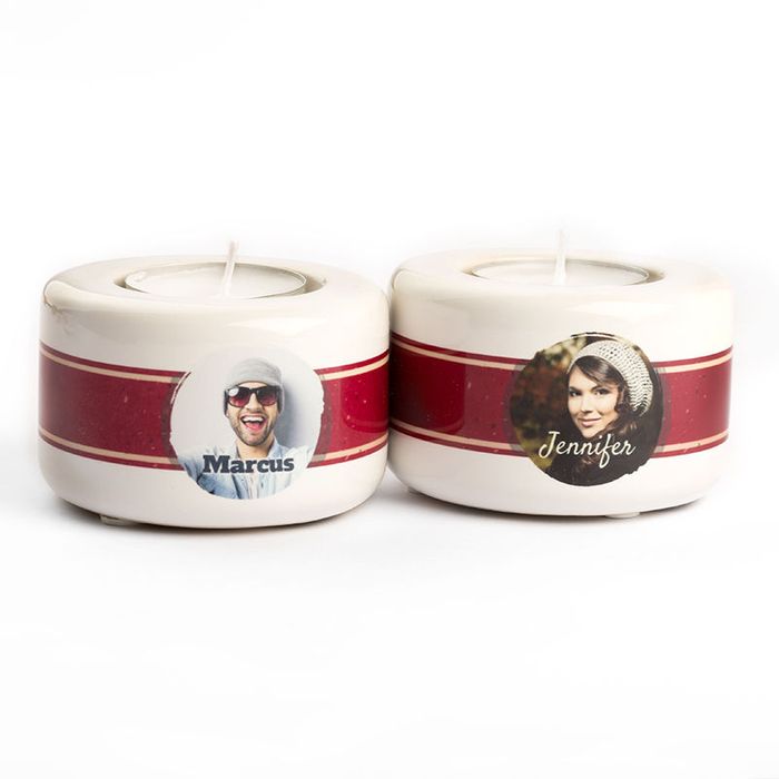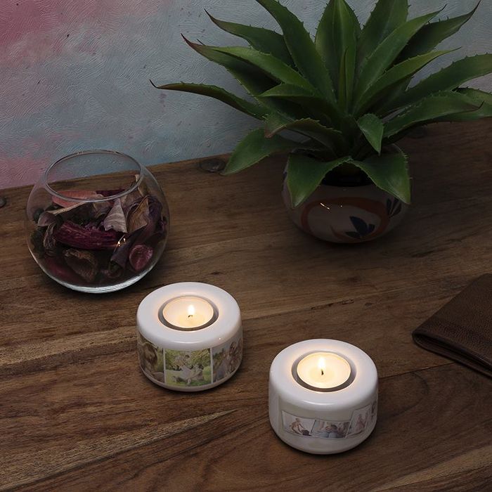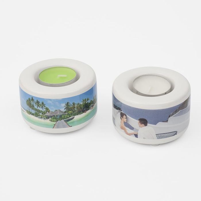 There's nothing more charming than flickering candle light to add atmosphere to any room. Our set of 2 ceramic tea light holders are ideal for setting a romantic mood, making bubble baths more relaxing and giving homes, gardens, massage rooms a beautiful ambiance. Print your photo, unique design or special message and transform the humble candle holder into something stunning.