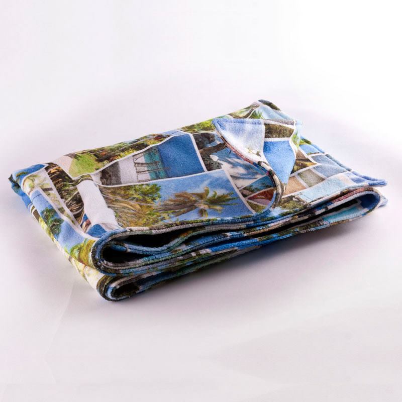 Please be aware, these products are hand printed and fabricated one at a time. When you create a collage of photos on a beach towel with Bags of Love, you will receive a bespoke and one of a kind item. Your towel has a pile that pushed in one way shows the beautiful picture montage, and pushed the other way shows the beautiful picture montage. However, you might notice small flecks of plain white textile deep down in the fibres. This will be very minimal and will not take away from the beauty of style of your personalised photo montage beach towel. The edges of the towel are hand hemmed for that touch of handmade quality.