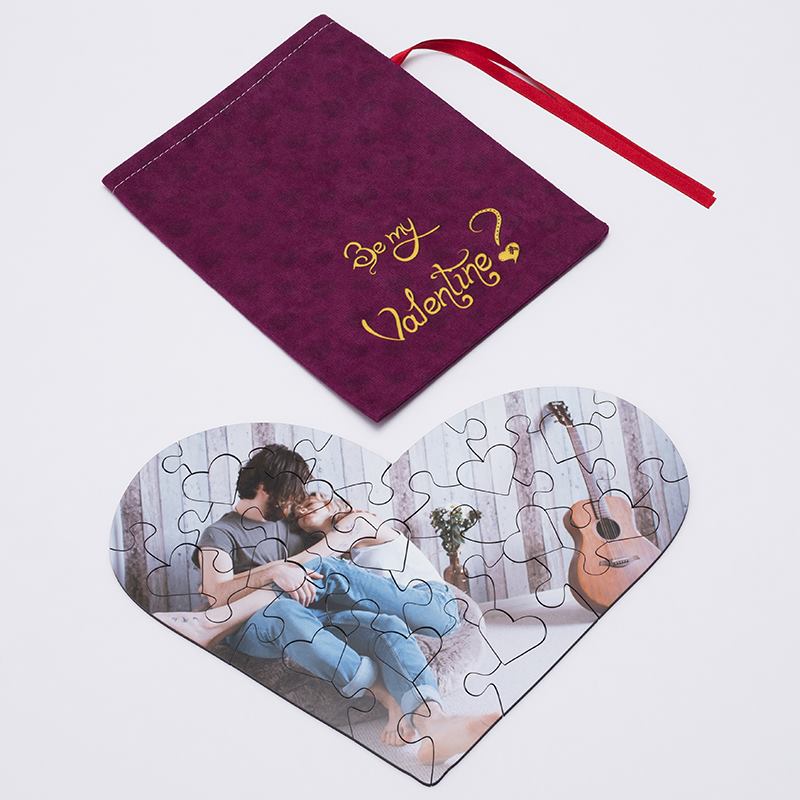 Just upload the photo into our template and we send you your custom heart jigsaw puzzle in a gorgeous pouch. The recipient can only guess what this is until the mystery of making the heart puzzle forms. Then they will see a beautiful heart jigsaw puzzle with photo on it. Order your heart puzzle today and make them melt. 32 pieces of love printed on wood or 75 pieces printed on firm good quality cardboard. Use our heart puzzle to great effect and make someone deeply happy.