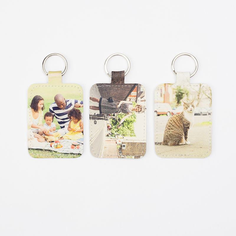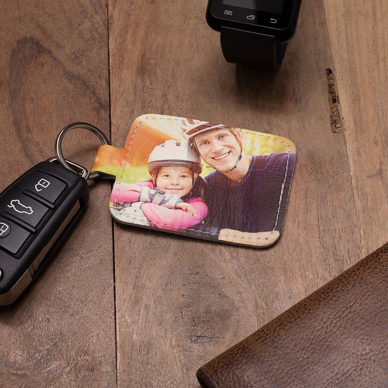 It's not often you can get a unique creation made especially for you that involves several crafts. Think about our unique personalised photo keyrings. Your key ring has to be made from cut piece of selected prime leather. Then we have to print your design on it. just letters but actual printed images. We are one of the first to make leather key rings printed with your images. The real beauty of this is you are the one designing the key ring online and we are just following your instructions to print and make it. Make your own personalised photo keyring double sided in our easy to use design tool. And you can have different picture each side.