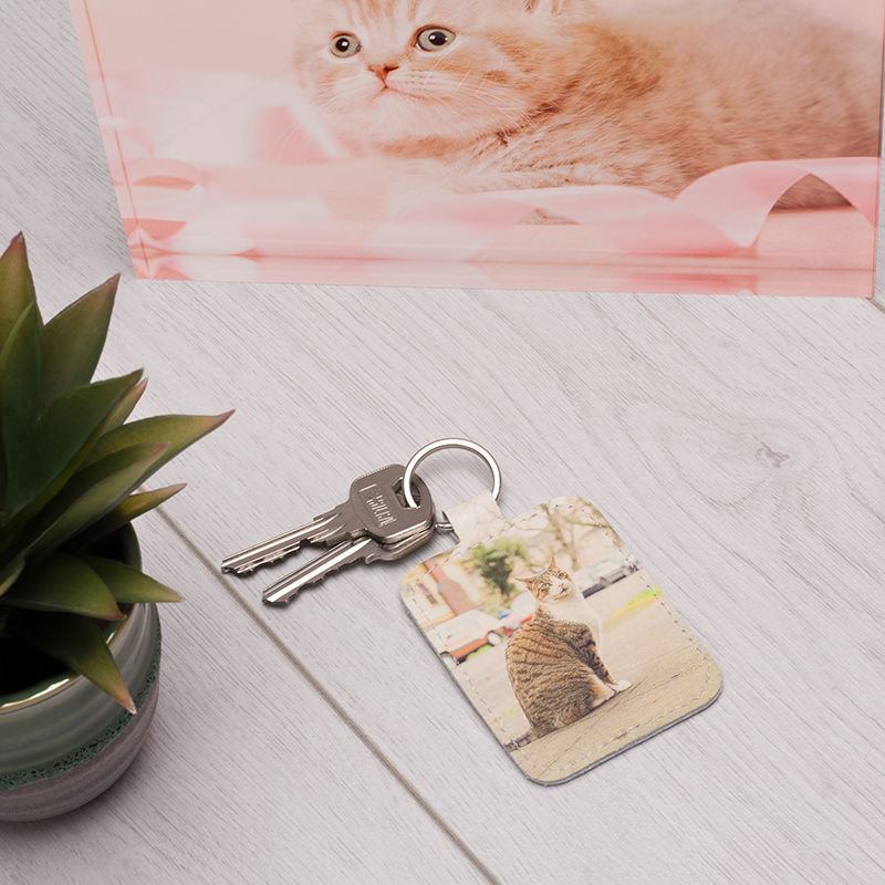 Going one step further than adding initials to a key ring, we wanted to create a whole new keyring idea. Printed leather keyring personalised by you with your images, text or both. It's a high level of personalisation that we offer on a high grade leather product wit ha polished metal ring. Our personalised photo keyring is a not available elsewhere. It is an exclusive design and pattern that we developed along with our printing on leather technology.