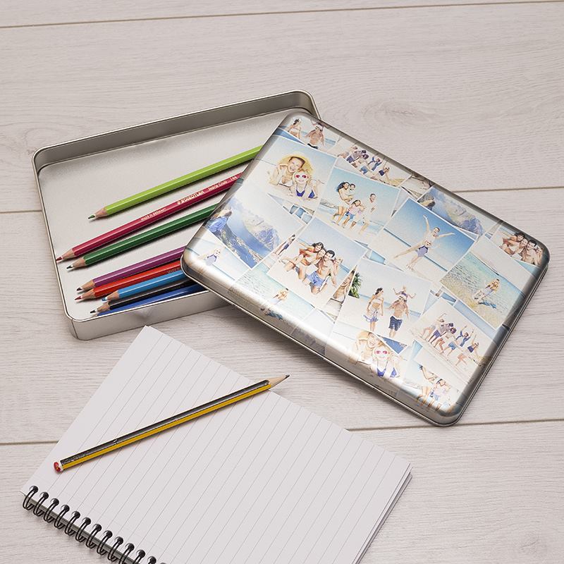 Design your own tin collection for a fun and original way to store anything from cakes and biscuits to medication and stationery. When it comes to organising little bits and pieces, a customised storage solution makes it quick and easy to identify what you're looking for. The print of your designs wraps elegantly around the curved edges of the lid, resulting in a flawless 3D effect with an authentic silver metallic finish. We print directly onto the surface to ensure your designs are bright, vibrant and permanent, with a gorgeous 'etched' aesthetic. Choose from a deep cake tin gift box or a shallow A5 tin.